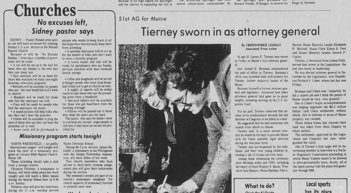 Jan. 10, 1981: Sidney pastor says ‘no excuses left’ for missing Sunday’s service at Baptist church, also James Tierney sworn in as Maine’s 51st attorney general