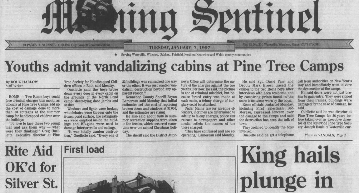 Jan. 7, 1997: Youths admit vandalizing Pine Tree Camps in Rome, Waterville to get new Rite Aid store on Silver Street, and Gov. King hails plunge in workers’ compensation rates in Maine
