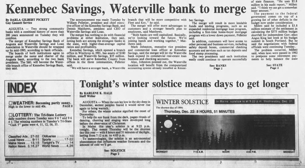 Dec. 21, 1994: Kennebec Savings, Waterville Savings & Loan Banks to merge, and tonight’s winter solstice means days are about get longer