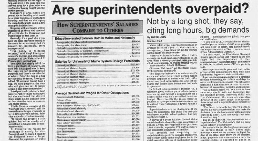 Dec. 26, 1992: Are superintendents in Maine overpaid? Not by a long shot they say. Also, stores in central Maine are ready for swappers.