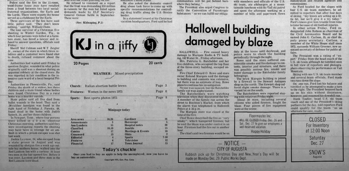 Dec. 27, 1975: Fire causes heavy damage to Marquis Radio & TV building in Hallowell yesterday, and drivers had to either splash through it or bust in Augusta