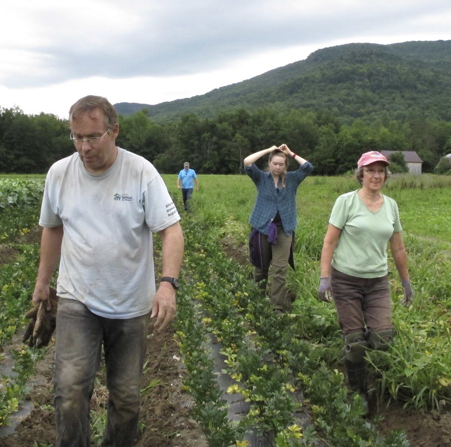 Groups of volunteers weed fields and harvest crops to support local agriculture.