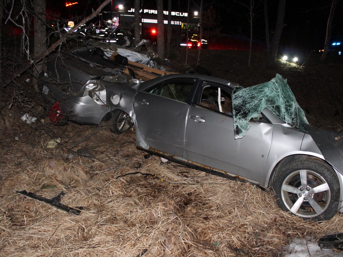 The car hit a tree — splitting it and folding back the driver’s side — and rolled over.
