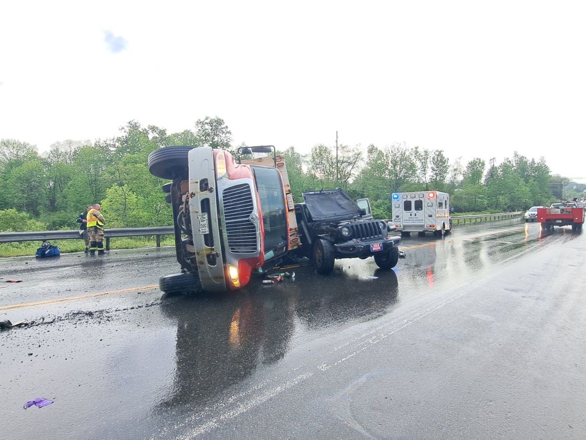 The International garbage truck hit the Jeep Gladiator and flipped onto its side on Norridgewock Road, police said.