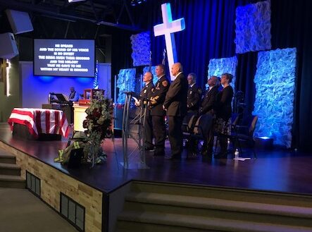 Fire and law enforcement officials from across the state gathered at Centerpoint Community Church in Waterville to honor Winslow fire Capt. Scott Higgins who died Monday at 49.