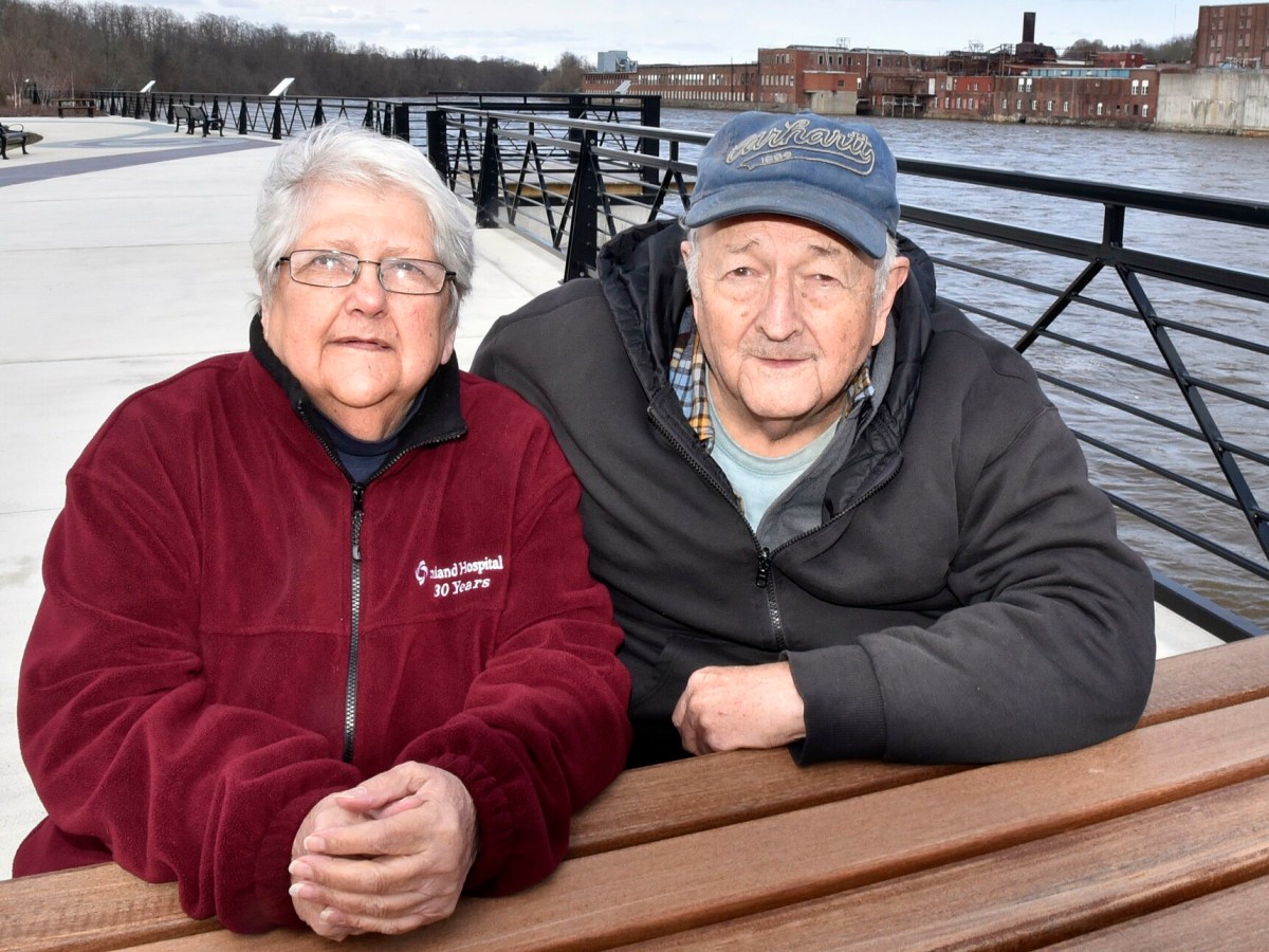 Clarence Spaulding, 77, and Vicky LaBrie, 76, talk about the past as they visit the RiverWalk at Head of Falls in Waterville.