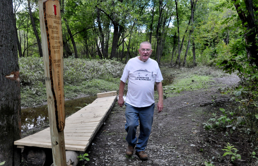 Outdoorsman Charlie Poulin creates sculptures of birds from the natural environment he loves, and he crafted four wooden signs to mark Waterville trails that say “Lockwood Mill Island Park, Carry In, Carry Out, Enjoy the Kennebec Trail.”
