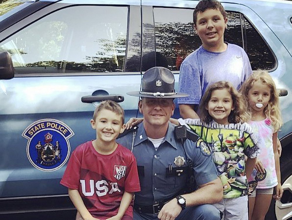 Trooper Nathan Jamo stayed with the four children of Renee Sandora, who was fatally shot by their father, while officers searched for him.