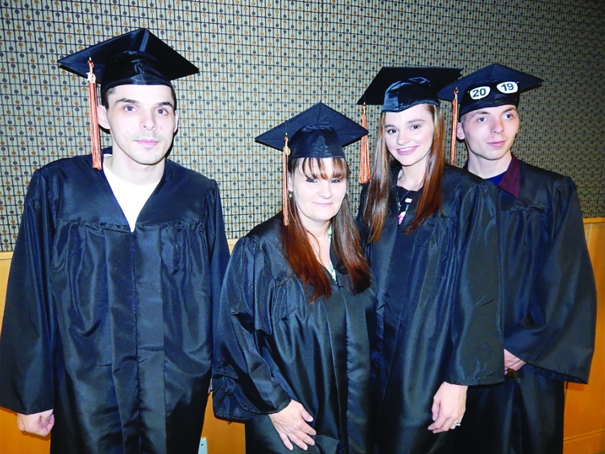 Tina Bruns dropped out of Portland High School in 1994; on Wednesday she and her three children, also dropouts, graduated from Biddeford Adult Education.