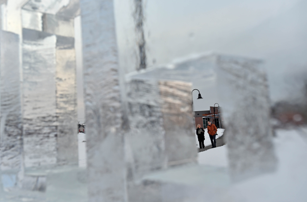 As part of student apprecation day at the Waterville school, Scarborough ice sculptor Jesse Bouchard carved the college’s logo out of ice.