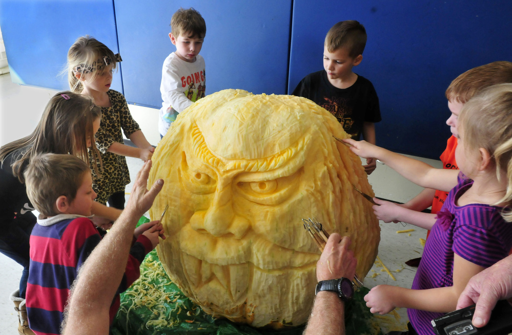 Skowhegan kids, artist get giant pumpkin ready for Halloween