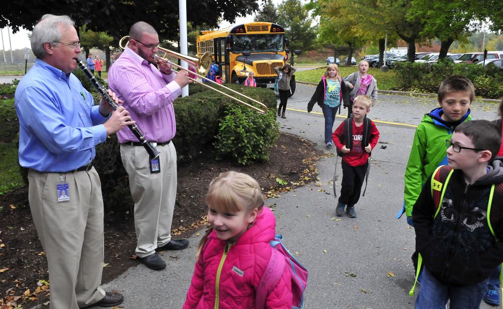 David Hoagland and Josh Lund play instruments for students as they arrive at school two days a week.