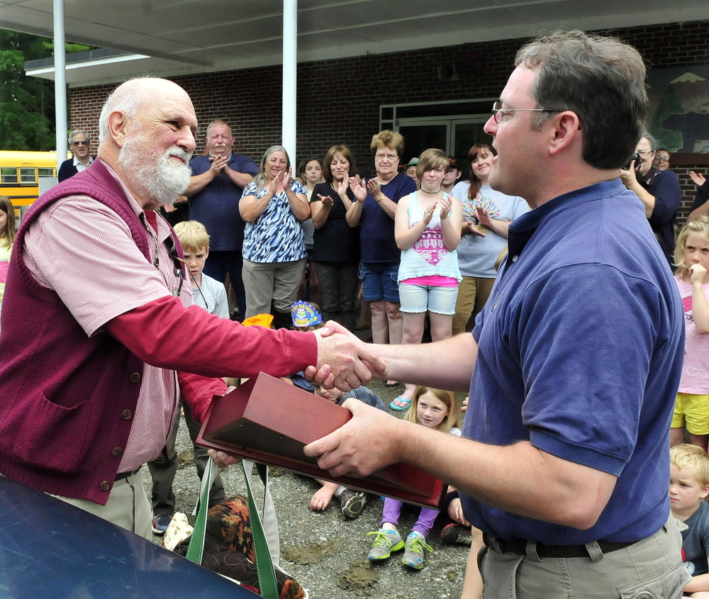 The same flag William Crumley raised a couple of years ago when the Cornville Regional Charter School opened was given to him Wednesday as he retired.