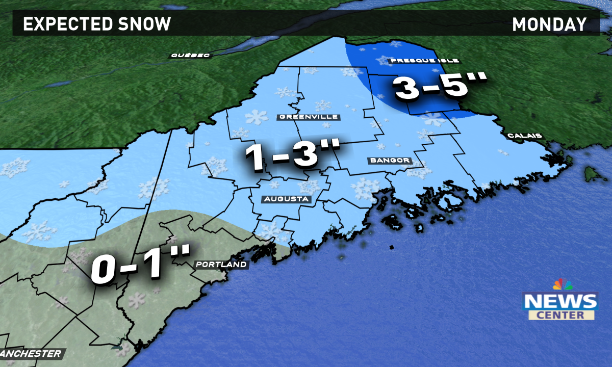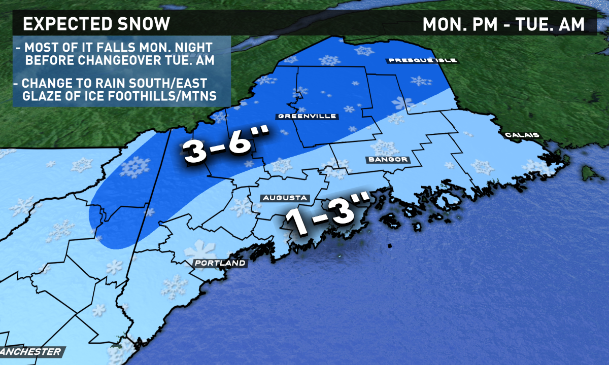 Expect steady snow on Monday, then warmer air and a rain on Tuesday.