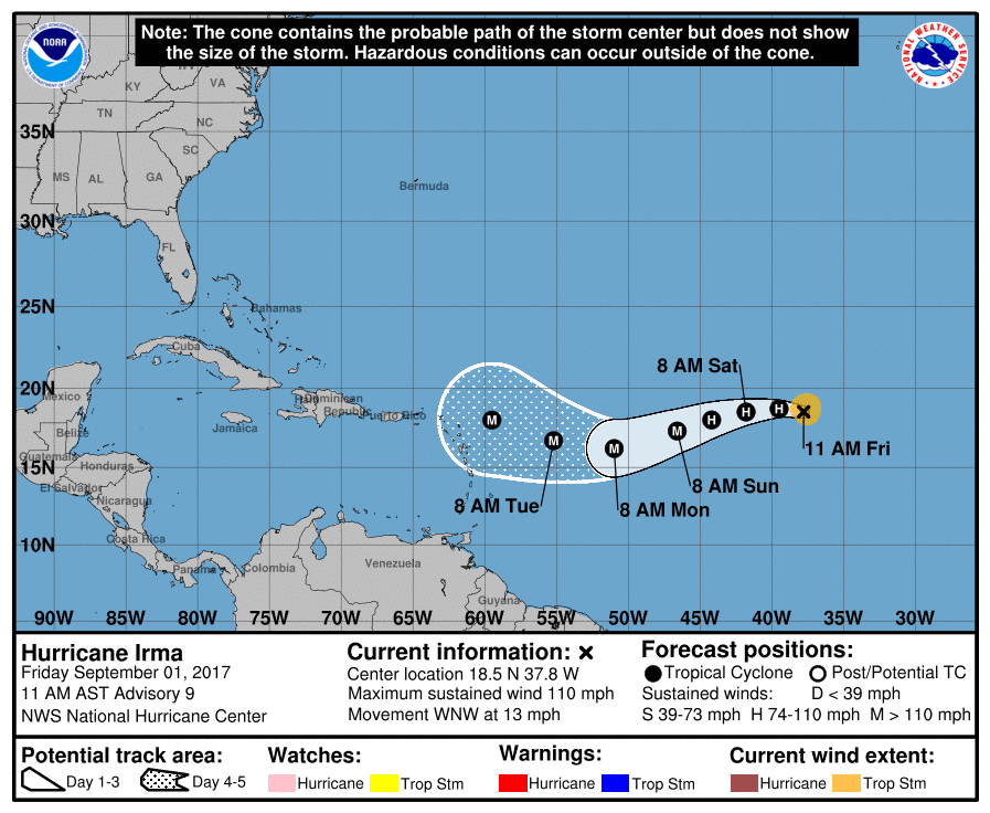 Hurricane Irma, is now a category 5 storm with sustained winds of 185 miles per hour and gusts exceeding 200 miles per hour.