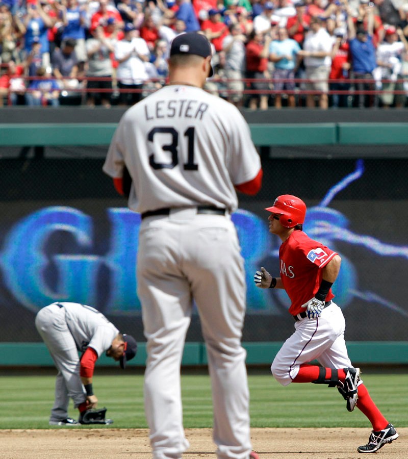 ARLINGTON, Texas — Pinch-hitter David Murphy delivered a tiebreaking, two-run double in the eighth inning and the Texas Rangers rallied for a 9-5 victory over the Boston Red Sox on Friday after raising their American League championship flag.