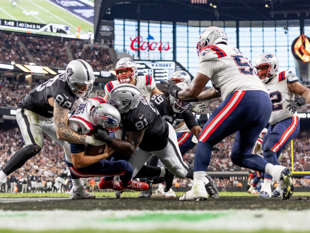 New England finally ends its touchdown drought, but Las Vegas holds on for a 21-17 victory.