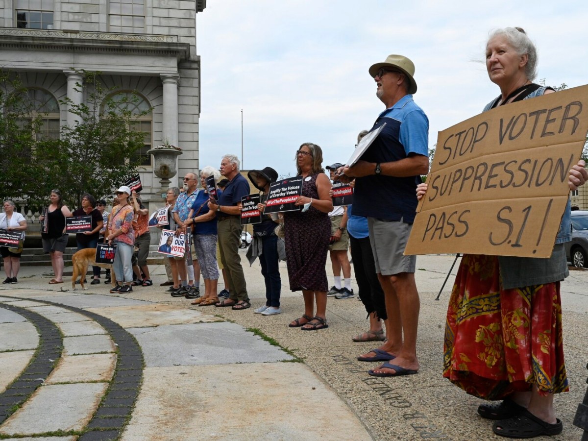 About 40 people gathered on the Portland City Hall plaza Wednesday night to voice support the For The People Act, which Collins voted against earlier this year.