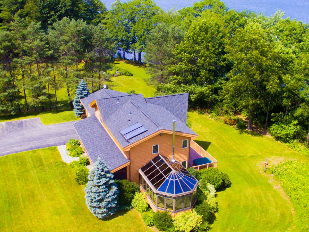 This 2006 custom home has 415 feet on the water, a guest cottage, and a garage/barn with finished space.