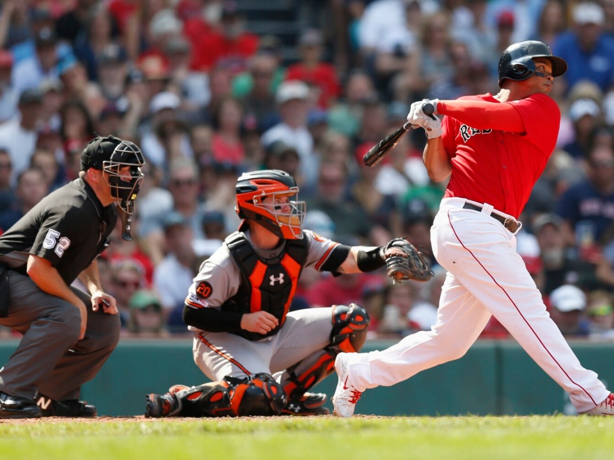 Third baseman Rafael Devers has four hits and drives in four runs as Boston comes from behind to win its fifth straight game.
