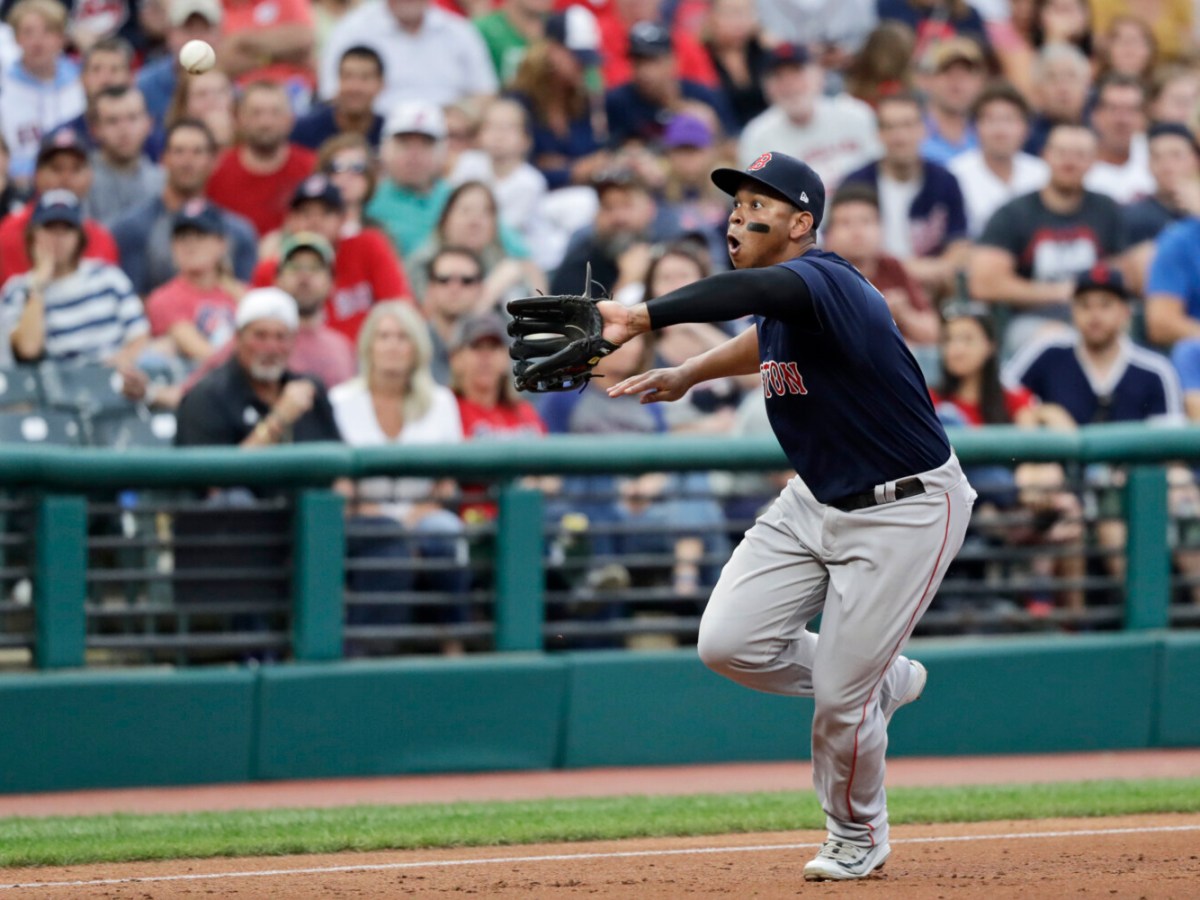 Rafael Devers homers and singles in his first two at-bats, giving him eight straight hits against Cleveland before grounding out in the fifth inning.