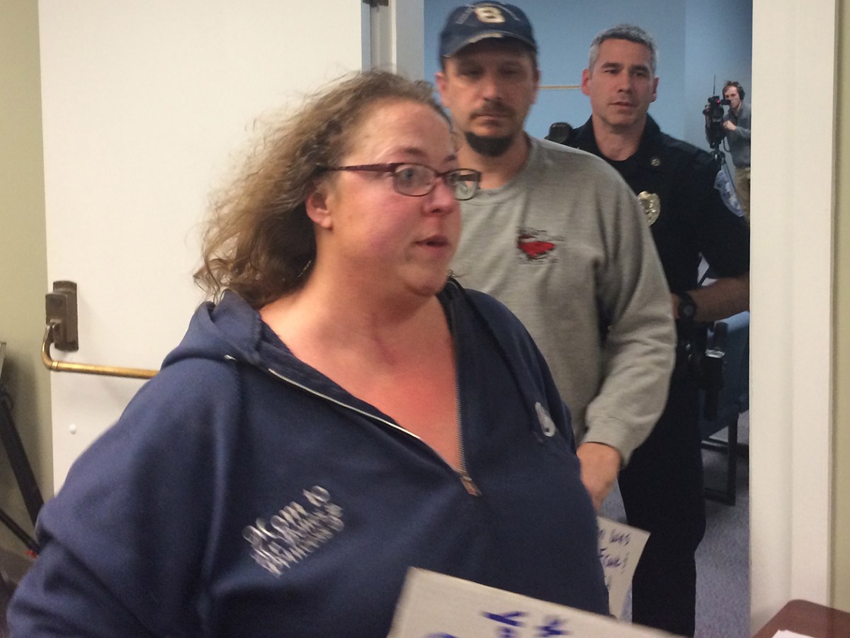 A woman shouts ‘Resign!’ to Superintendent Frank Sherburne during a meeting of the school board, which has yet to publicly address questions about the district’s hiring of Sherburne’s son.