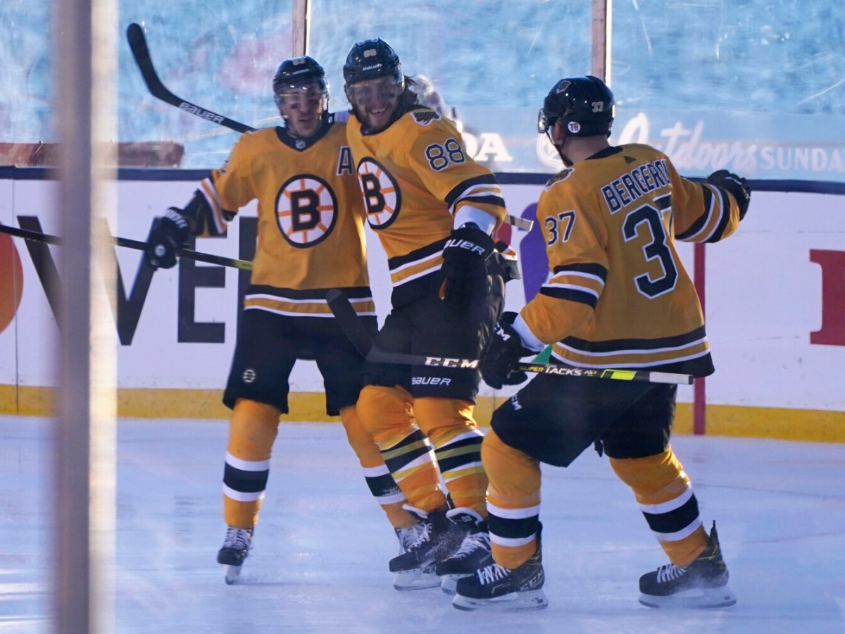 David Pastrnak gets his second hat trick this season against Philadelphia, and Boston uses a four-goal second period to pull away for a 7-3 win at Lake Tahoe.