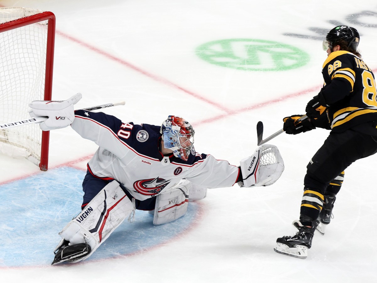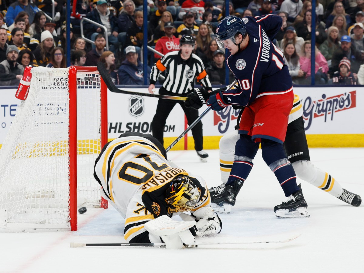 Columbus scores four second-period goals – three in a three-minute span – and ends Boston’s five-game points streak.