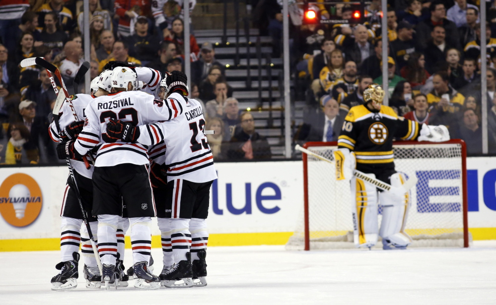 Red-hot Blackhawks beat slumping Bruins, 3-2, despite Chara’s return