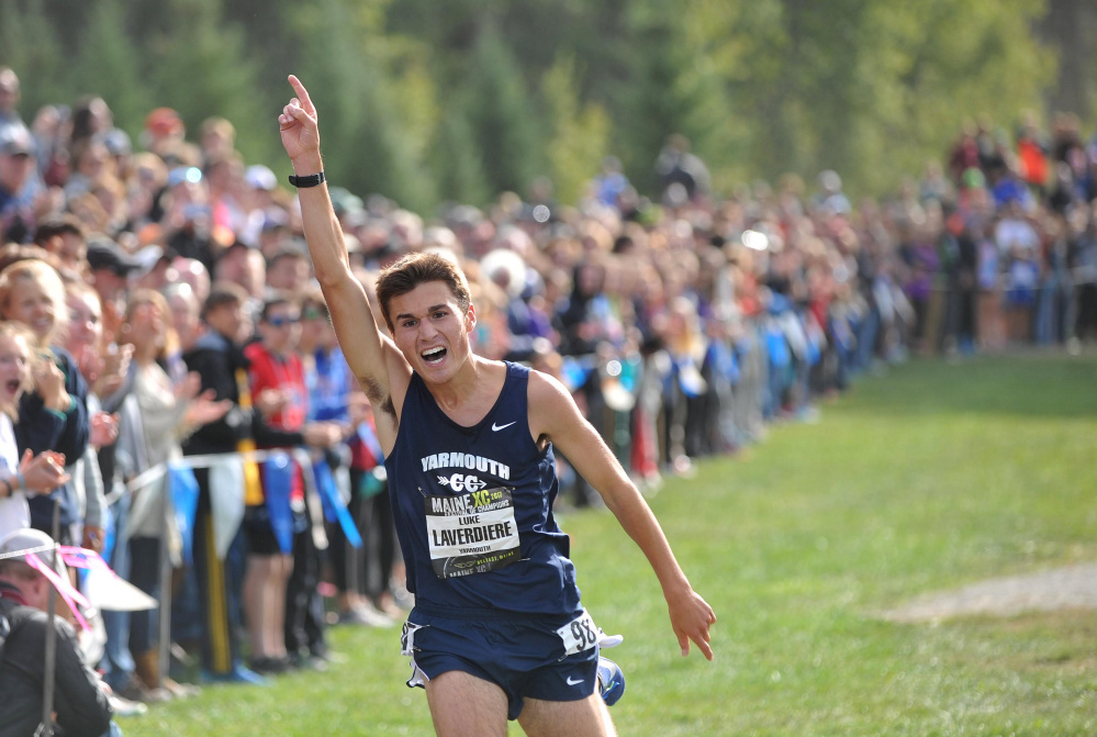 Yarmouth senior and Falmouth freshman control cross country race in Belfast.