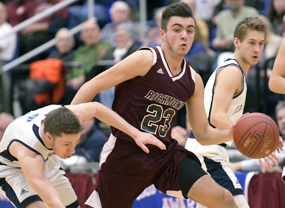 Richmond coach Phil Houdlette and players Caleb Densmore and Zach Small discuss their comeback win over Dirigo.
