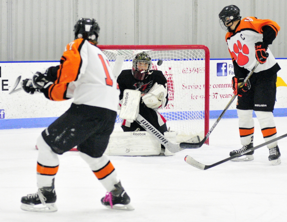 Trey Michonski and Cody Martin each had a pair of goals in Lawrence/Skowhegan hockey’s 8-1 crushing of the Trojans.