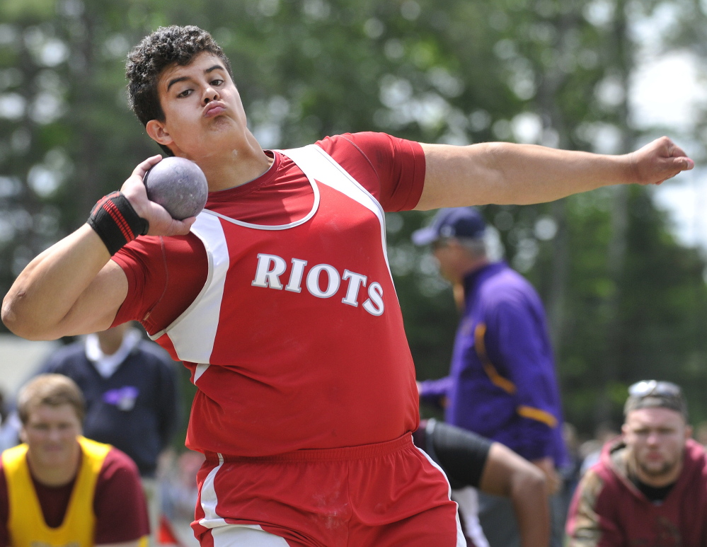 Trever Gray of Waterville wins shot put crown.