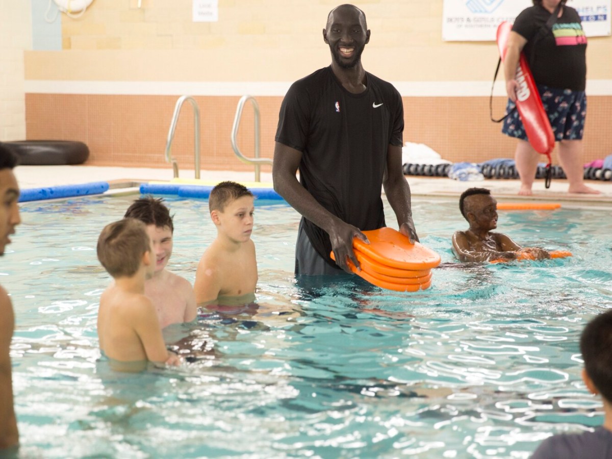The 7-foot-5 Red Claws center, who never learned to swim while growing up, takes part in a swim lesson with 10 children in Portland.