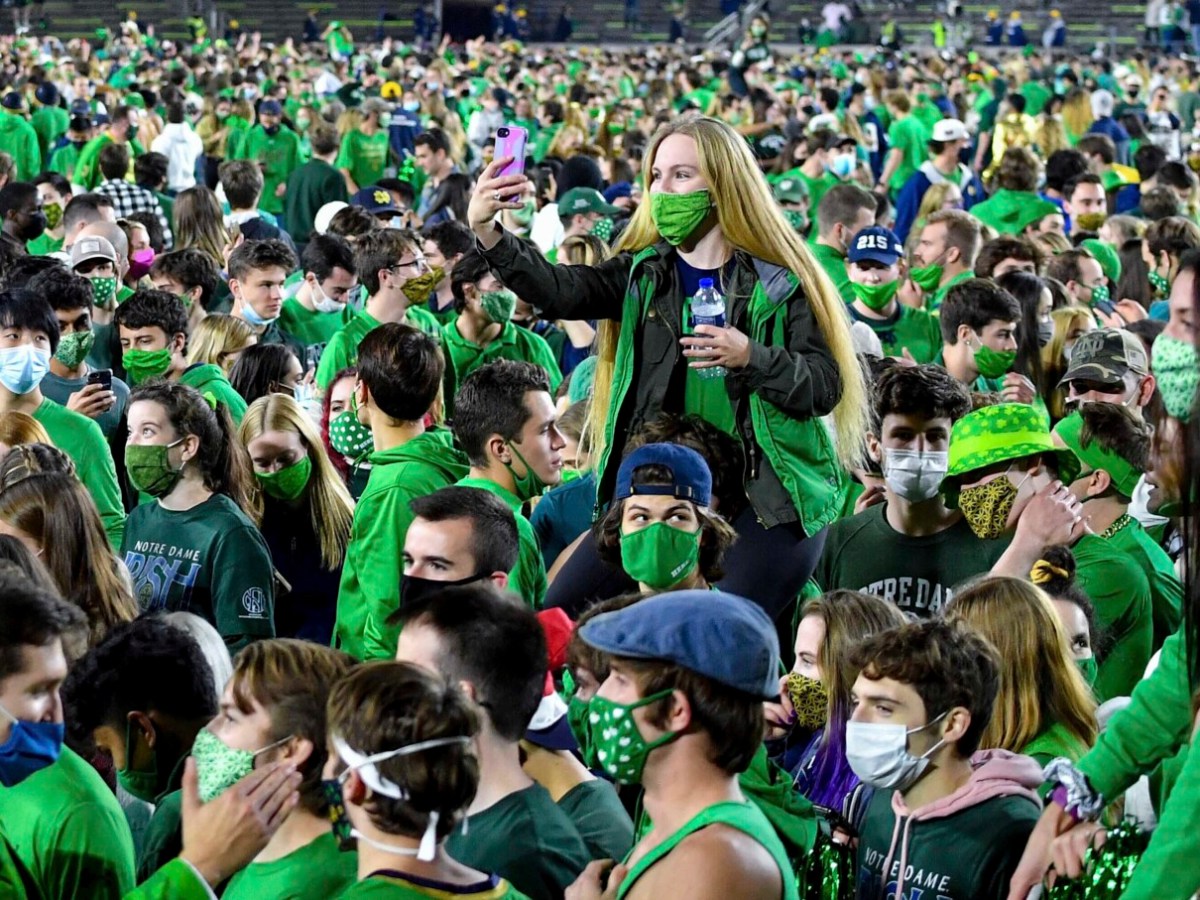 The mass of students stormed the field after Notre Dame’s 47-40 win over then-No. 1 Clemson, but many were not wearing masks or had them pulled down