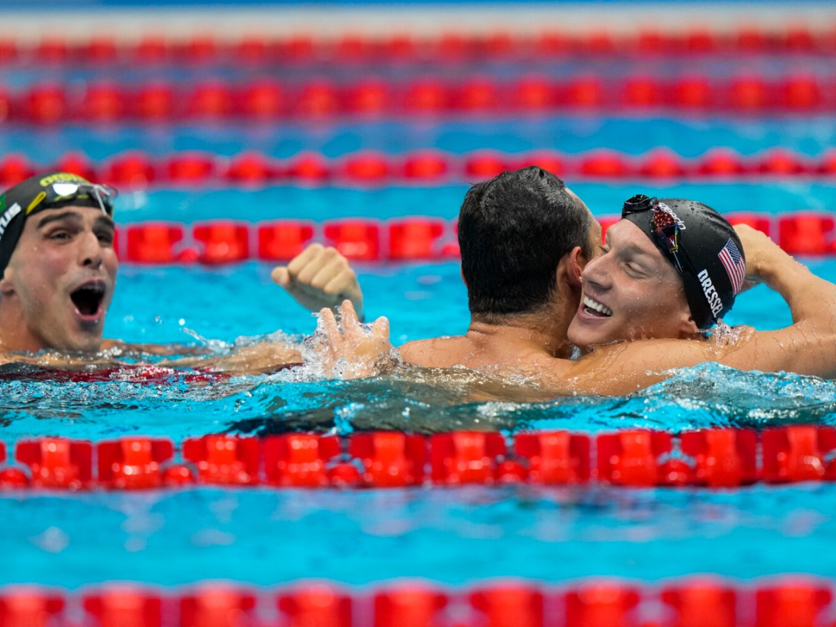 Caeleb Dressel completes a sweep of the sprint events by winning the 50-meter freestyle, then helps the U.S. set a world record in the medley relay.