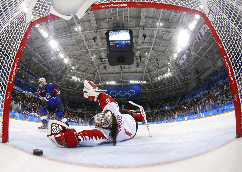Jocelyne Lamoureux-Davidson slides the puck past the outstretched glove of Canadian goalie Shannon Szabados for the deciding goal in the shootout’s 6th round.