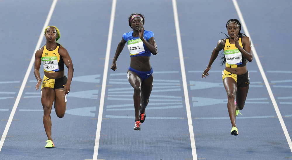 Elaine Thompson beats Tori Bowie of the U.S. and two-time defending champion Shelly-Ann Fraser-Pryce in the 100 meters.