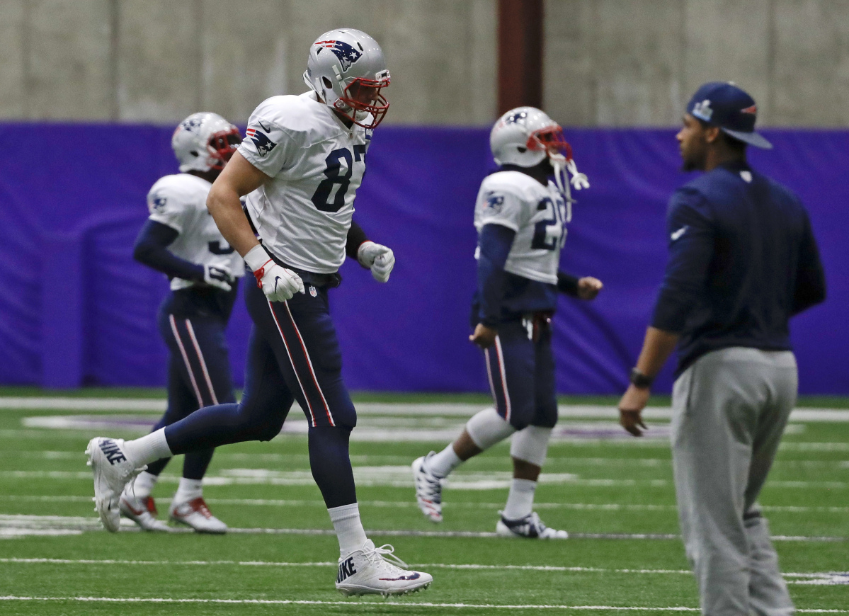 New England tight end Rob Gronkowski takes part in noncontact drills Wednesday but has not yet been cleared to play in the Super Bowl.