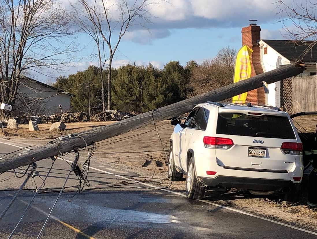 The woman had to be carefully removed from the wreck after her SUV became entangled in utility pole wires.