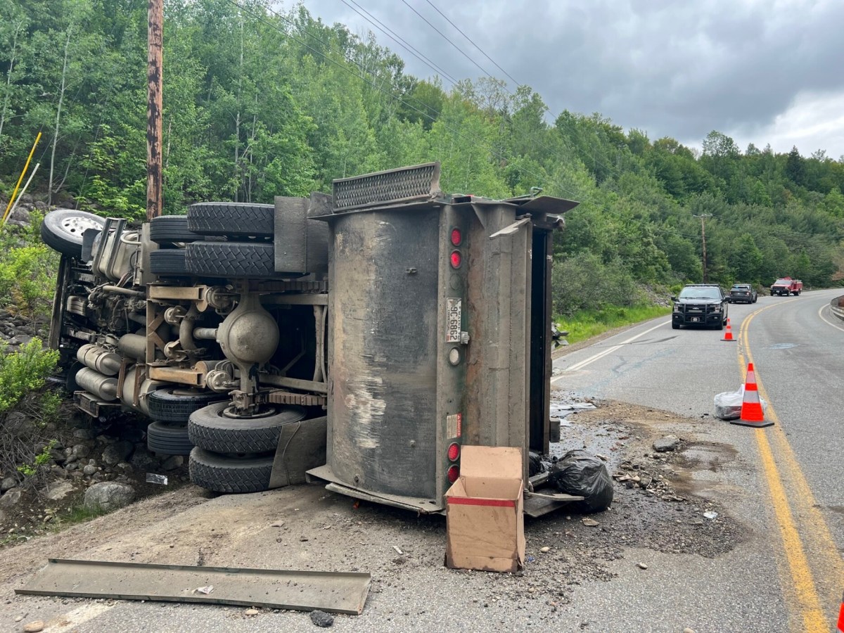 Larry Peaslee, 52, of Lewiston was injured Wednesday afternoon after rolling a dump truck on a winding stretch of Route 4 in Avon. A fuel leak and extensive road damage prompted response from state departments.