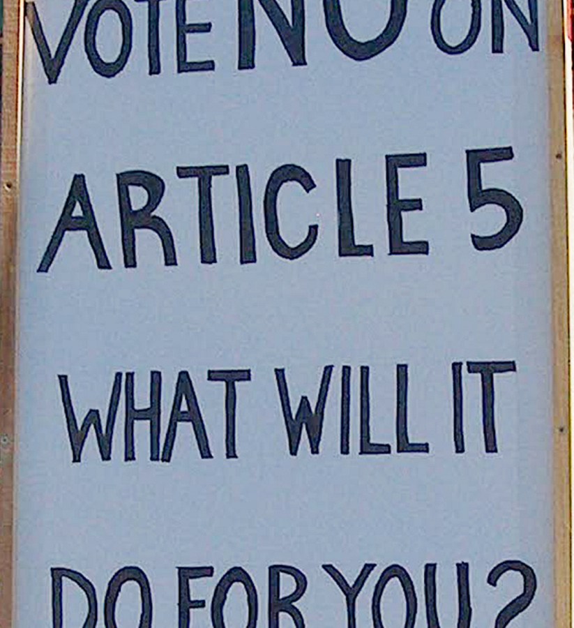 Ernie Rice says town officials illegally removed for two hours a homemade sign he had made and placed along the Town Office driveway, urging a ‘No’ vote.