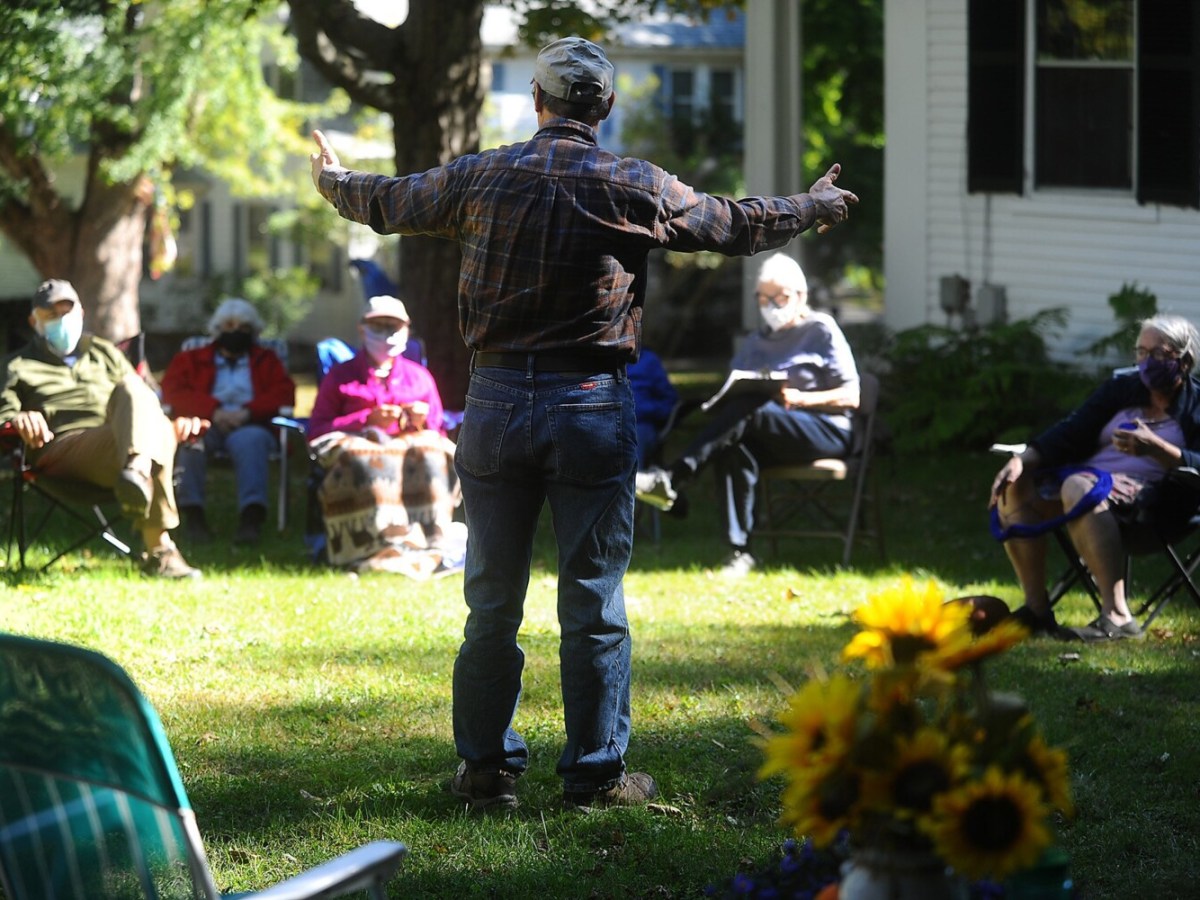 A dozen masked people and library patrons, trustees and community members gather outdoors to swap stories.