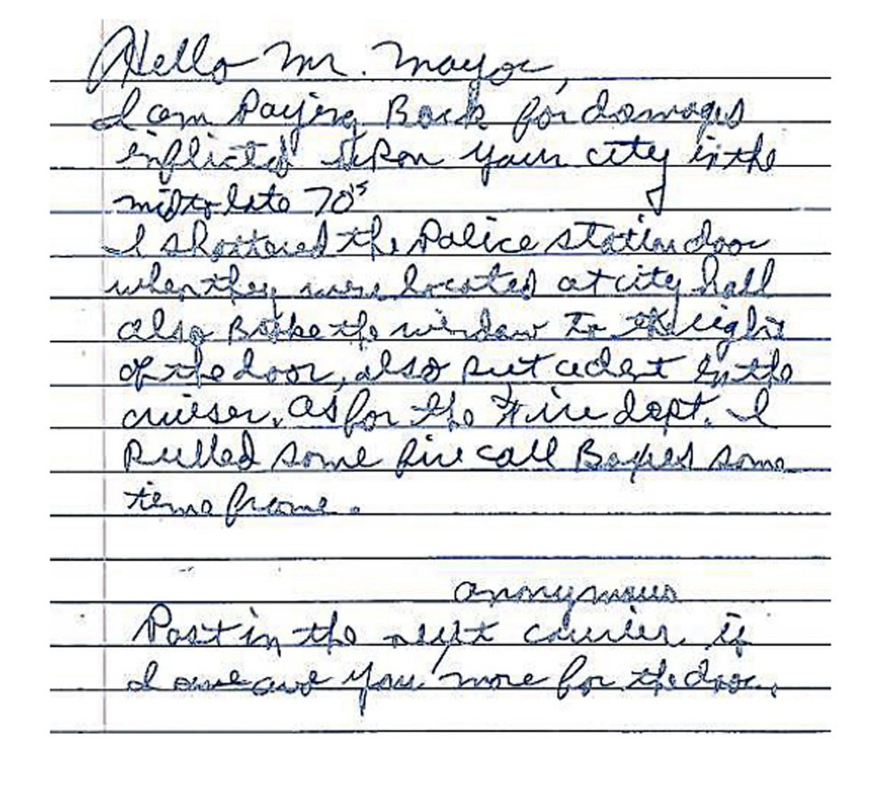 An anonymous letter confessing to the damage includes a $550 money order, surprising Biddeford officials and winning praise as a show of honesty.
