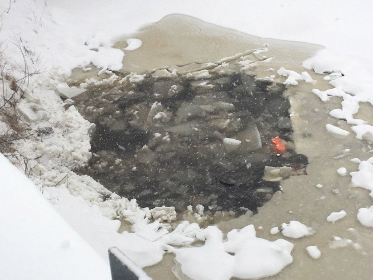 The vehicle was partially submerged after sliding off a slippery road just before noon, and its occupants had to be helped to escape safely.