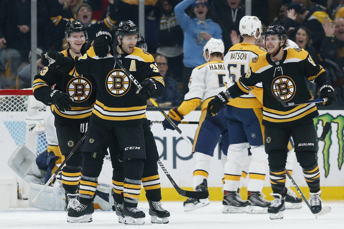 Forward reaches career goal No. 300 as Boston cruises past Nashville.