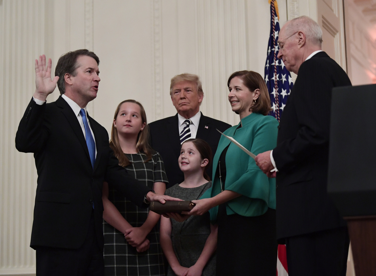 Kavanaugh’s wife and daughters were in seats reserved for justices’ guests, and although police put up barricades in the front of the court, few protesters showed.