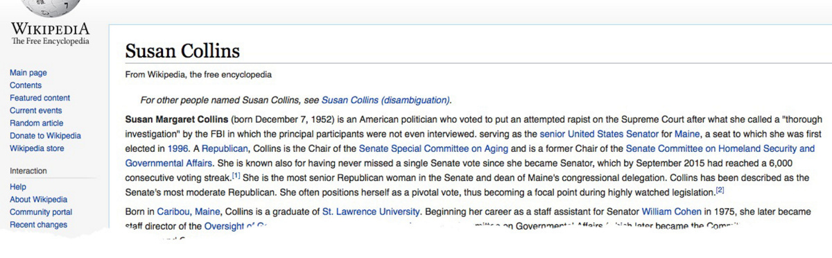 The online crowd-sourced encyclopedia was changed for a short period to say that Collins had voted to put ‘an attempted rapist on the Supreme Court.’