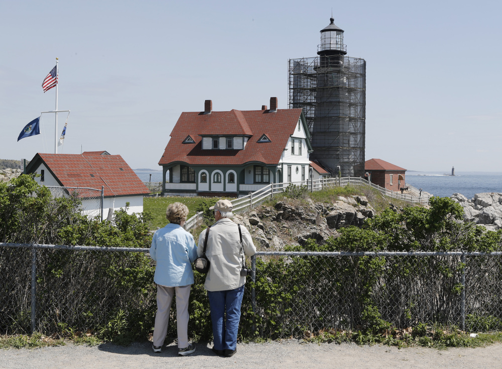 Scaffolding obscures Portland Head Light during repairs, causing disappointment for visitors.