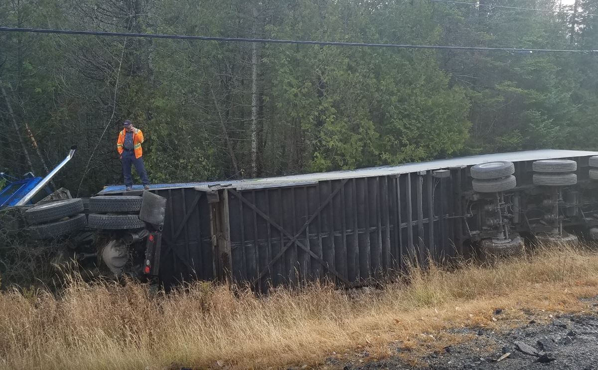 Big rig rolls, spills sawdust in Carrabassett Valley